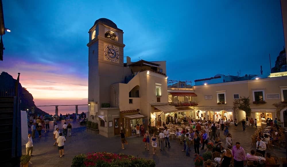 The bustling heart of Capri, ideal for people-watching and enjoying an espresso amid historic buildings and vibrant life.