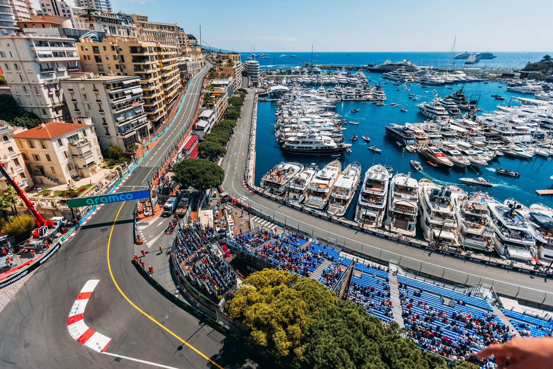 This is Monaco’s defining ticket layer — elevated viewing plus catering and controlled access.