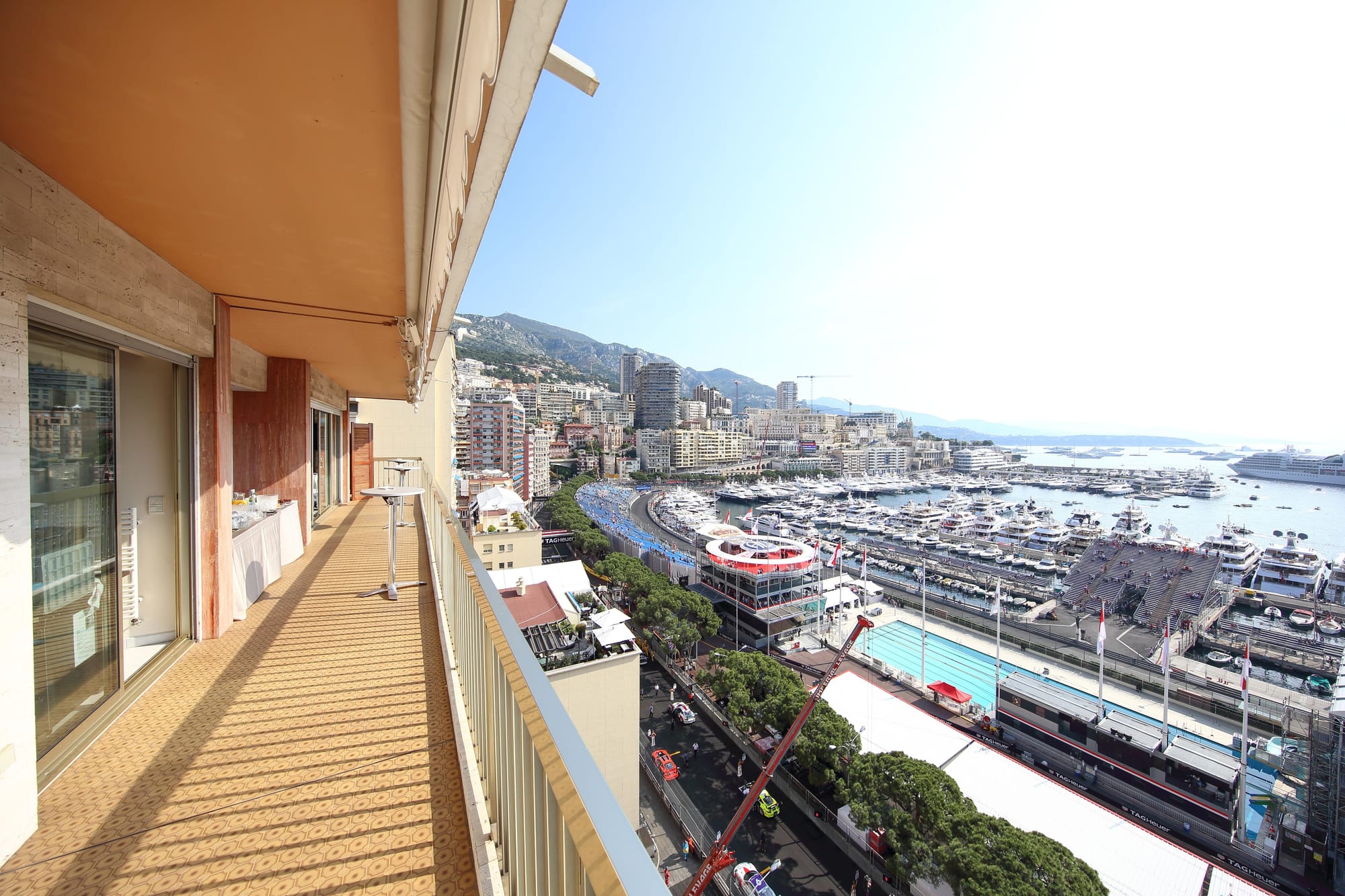 Marketed as VIP Panorama Terrace (often described as a high-floor terrace in the Panorama building), with sightlines that can include Sainte-Dévote and the climb toward Casino, plus harbour sections.