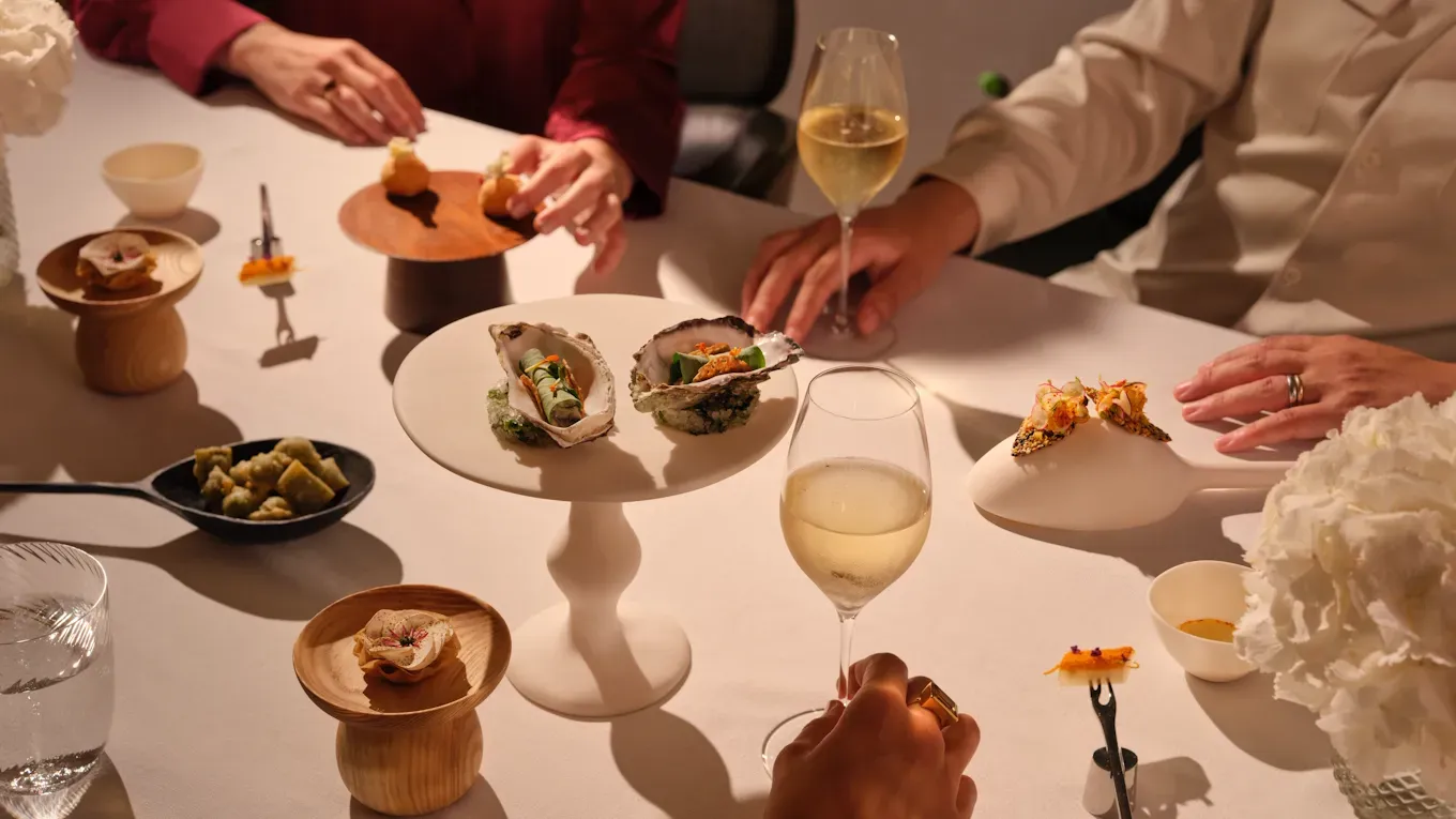 At Raffles London at The OWO, Mauro Colagreco presents a six-course tasting menu paired with Billecart-Salmon rosé. The kitchen leans toward seafood — oysters, monkfish — before moving into more personal dessert compositions. A graphologist offering handwriting-based compatibility readings adds a discreet layer of interaction without dominating the evening.