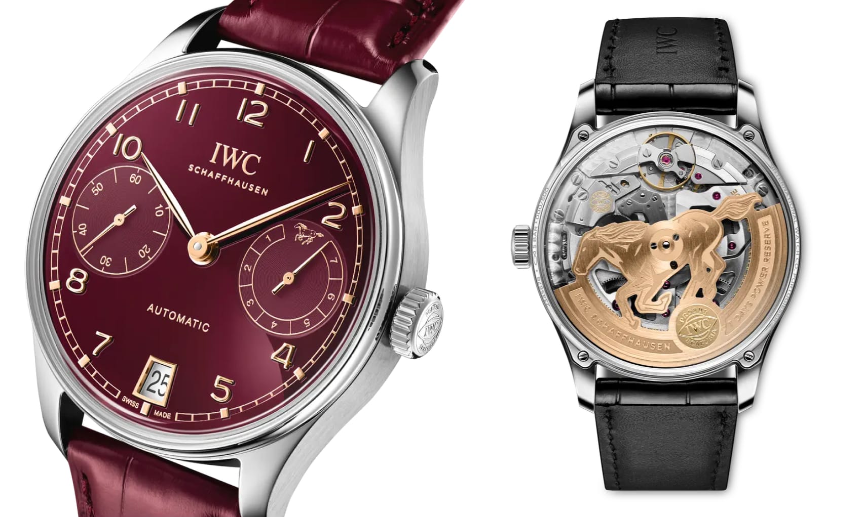 IWC marks the season with the Portugieser Automatic 42 “Year of the Horse”, powered by an in-house calibre with 7-day power reserve, and a standout detail collectors love: a gold-plated oscillating mass shaped like a galloping horse, visible through the sapphire caseback.