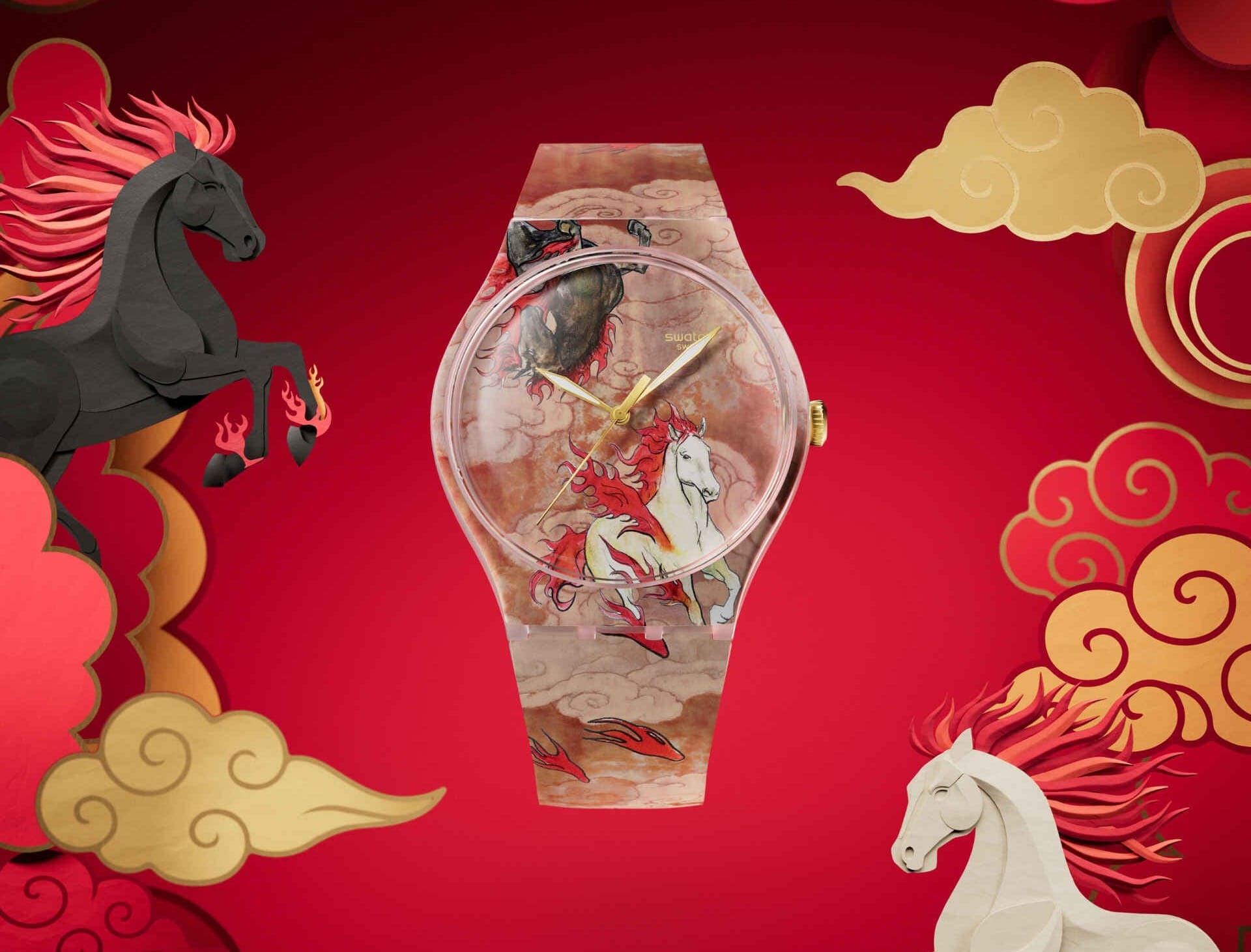 Swatch’s “RIDING THE CLOUDS” celebrates the Year of the Horse with a full-coverage illustration: yin–yang horses, clouds and flames as luck/prosperity motifs, designed to read like a modern scroll painting across dial and strap.