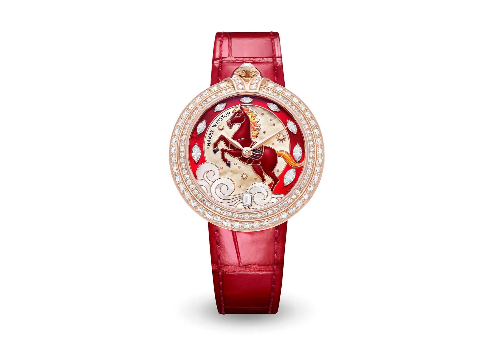 Harry Winston’s approach is signature “House of Diamonds”: the Chinese New Year Automatic 36mm is a limited edition of 8 pieces in 18K rose gold, with a fiery horse rendered in red lacquer and finished with Harry Winston’s diamond glamour.
