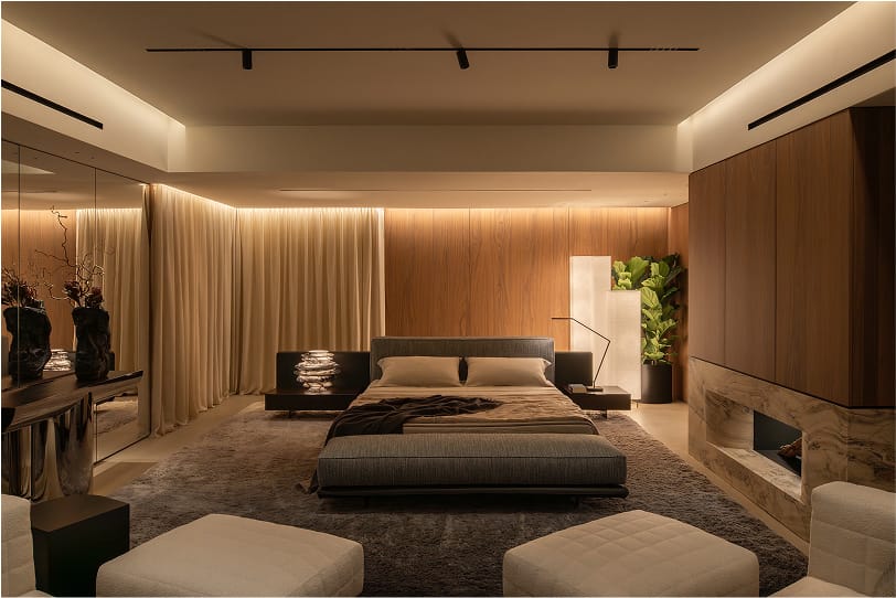 Descending to the lower level, the mood becomes warmer, more introspective. Here, lounging and night-time settings unfold in soft tones, cocooned in ambient light. An outdoor zone, featuring the Bézier Cord Outdoor system by Marcio Kogan/Studio MK27, evokes a gentle dialogue between inside and out — architectural and organic, refined yet relaxed.