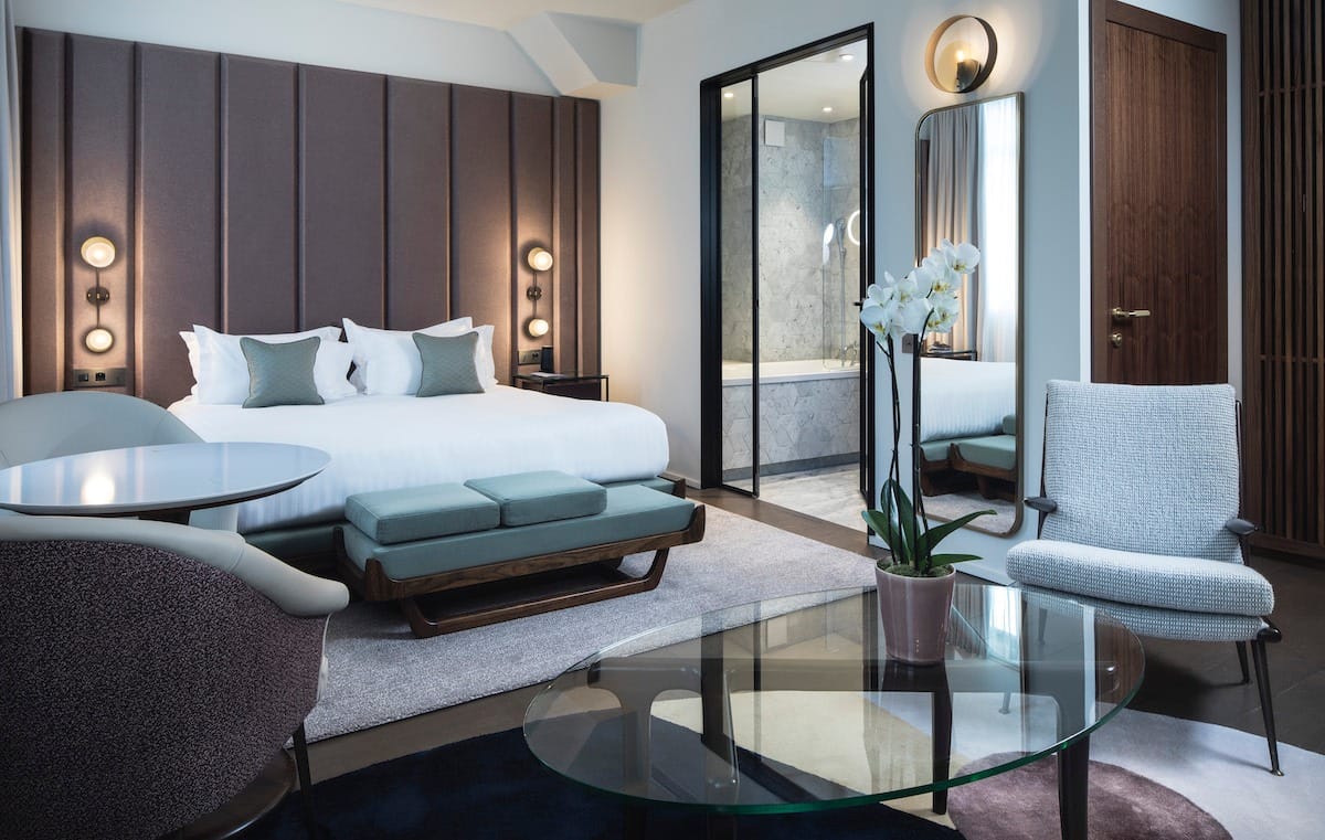 The stay begins with a romantic welcome, including a bottle of Louis Roederer champagne and macaroons at the very heart of the room. During their Parisian getaway, lovers will be invited to a stroll around Courbet showroom, a few steps away from the palace hotel, on Place Vendôme, to discover the precious bracelet Let's Commit, offered by the house. This jewel, from one of the most emblematic collections of the brand, has a laboratory-grown diamond with 18k gold, held by a poetic lanyard.