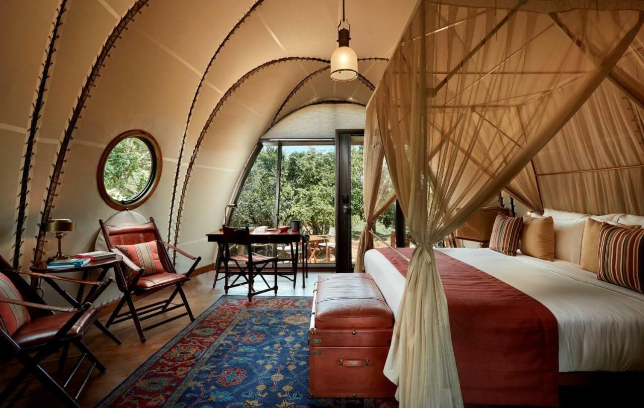 The unique design of the hotel — the joint brainchild of Dutch, English and Sri Lankan designers — is organically integrated into the surrounding nature. Only natural materials were used in its construction, and its bungalow tents look like huge boulders hidden among the greenery. Its elegant interiors hark back to the colonial age: four-poster beds, handmade copper bathtubs, and dark wood details.