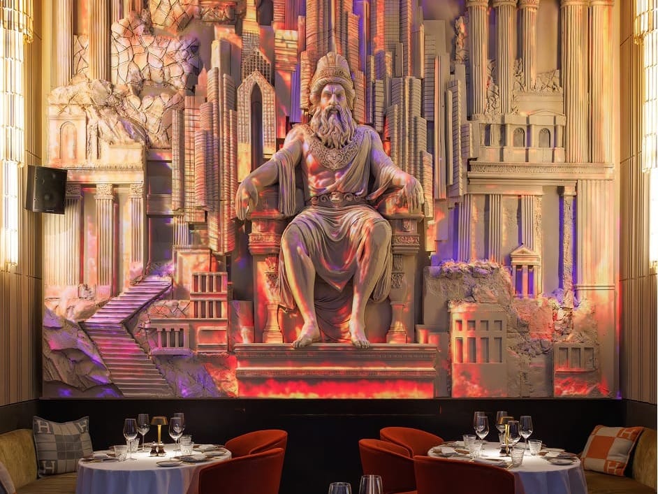 The concept draws loosely on Greek mythology — Zeus, Aphrodite, Olympus — but the reference remains atmospheric rather than narrative. Myth here functions as a visual and symbolic layer, not a theme that dictates the food. What defines Zenon more clearly is its use of AI-generated visual installations, developed in collaboration with Ouchhh Studios, which process live data from Dubai and translate it into evolving digital environments across the restaurant’s interior.